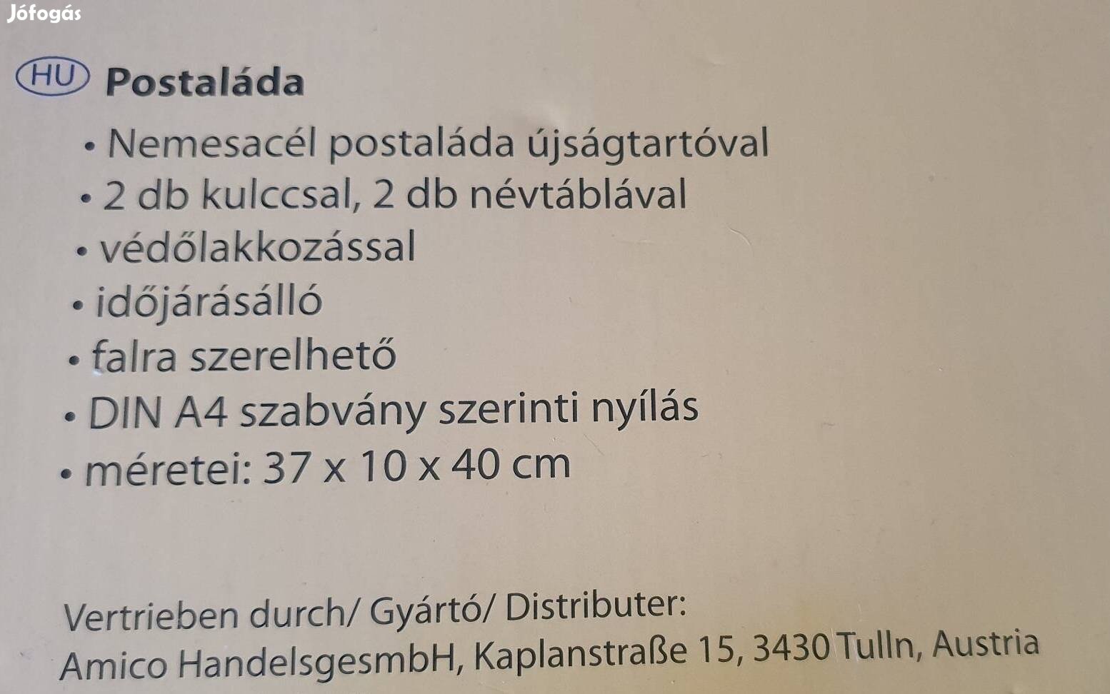 Nemesacél postaláda, falra szerelhető, 2 db kulccsal bontatlan csomagolásban eladó.