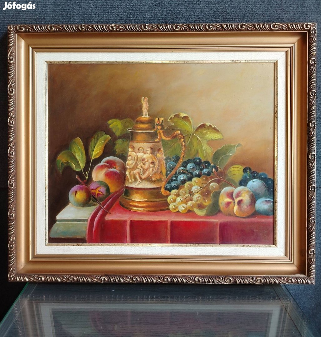 Varga Zoltán, olajfestmény, gyümölcscsendélet, 40x50 cm, kerettel: 56x66 cm, a keret hibás.