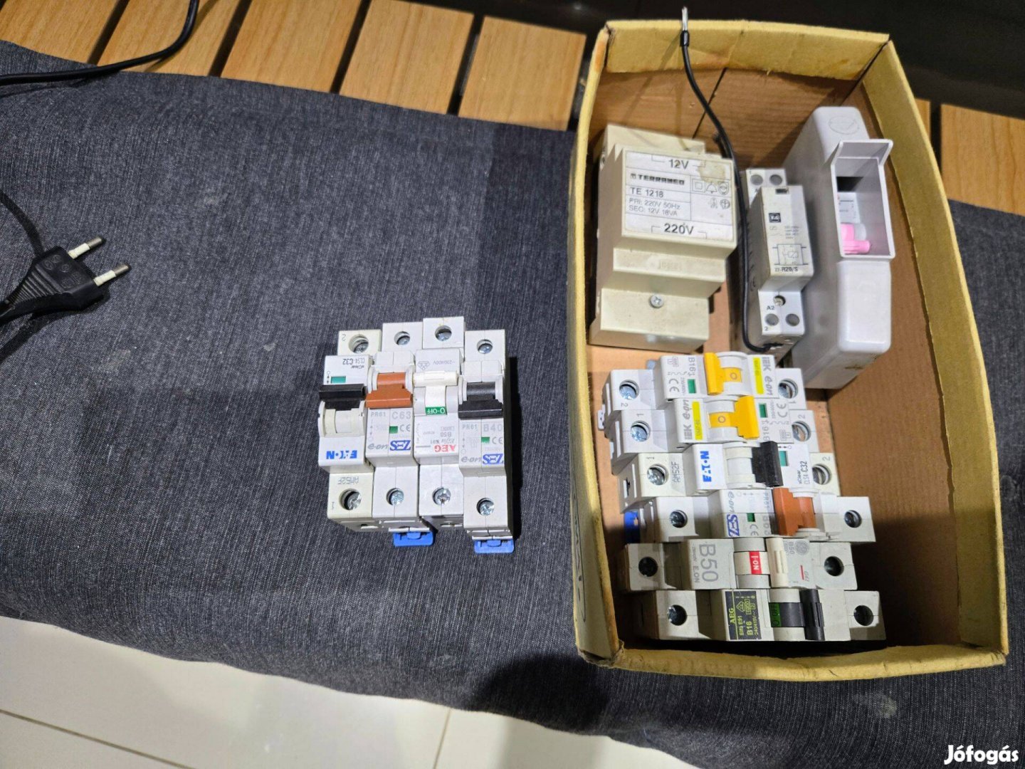 A képen látható villanyszerelési csomag egy vegyes összeállítás, amely kismegszakítókat, egy csengőtrafót és egy impulzusrelét tartalmaz