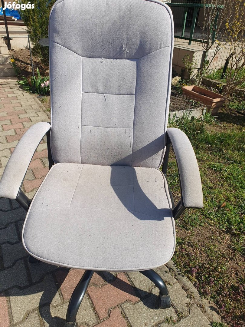 Képen látható forgó, gurulós, háttámlás, karfás, magasságállítós szék eladó. Huzata macska által megkarmolt, kissé macskaszőrös. Ill egy mélyebb kárpittisztítás is jót tenne neki. Ára ezért ennyi. Funkciójában nincs gond vele.