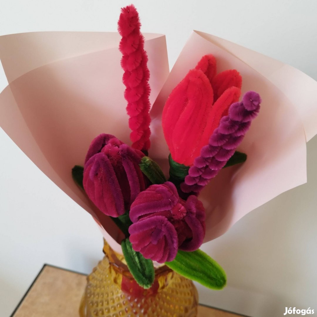 3 szál tulipán és 2 szál hullámos virágot tartalmaz