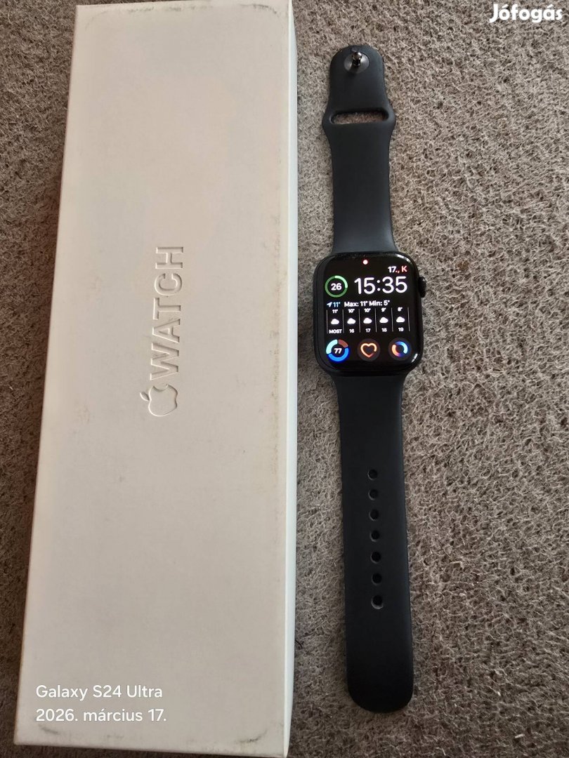 Eladó a képen látható Apple watch sertés 9 , 45 mm es, esim es óra. Használt állapotban, dobozában, töltövel.