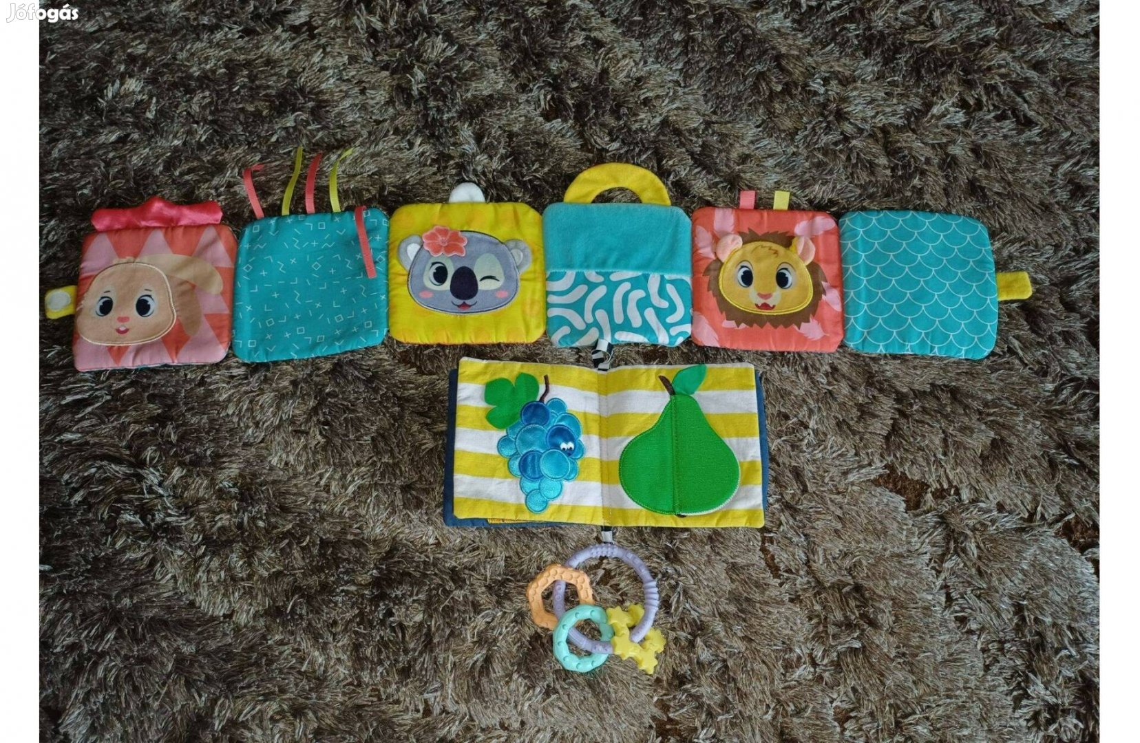 Kihasználatlanság miatt eladók a képeken látható baba textilkönyvek és rágóka.