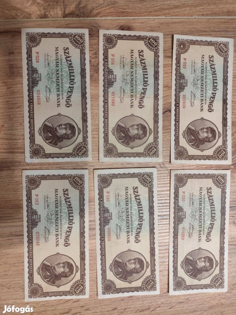 Eladó a képen látható 6db 1946-os kiadású 100 millió pengős bankjegyek.