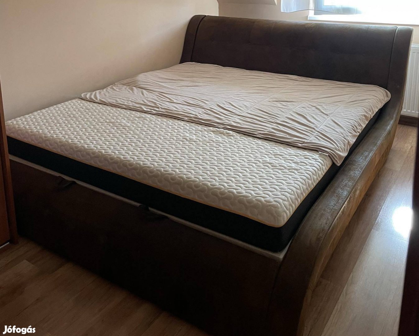 Eladó a képen látható ágyneműtartós franciaágy. Keret mérete 207 cm széles 250 cm hosszú tábla magassága 90 cm. Szivacs mérete 180x200. Elvihető a Memory foamos matrac is melynek a teteje cipzározható és mosható. A mosástól sajnos bolyhos lett.
