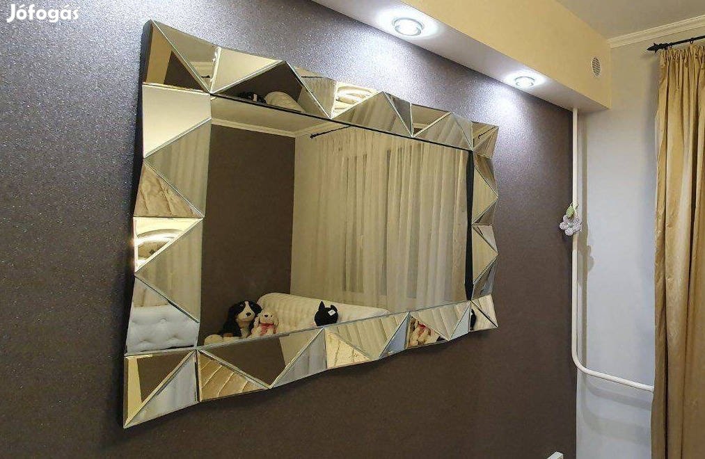Eladásra kínálok egy elegáns, különleges kialakítású falitükröt. A tükör kerete geometrikus, fazettált tükrös elemekből áll, amelyek exkluzív és modern megjelenést kölcsönöznek neki. Kiváló választás nappaliba, hálószobába, előszobába vagy akár szalonba is.