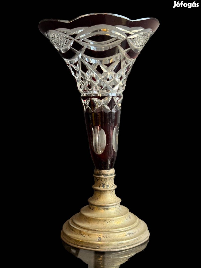 800 ezrelékes ezüst talp (Fővárosi Óra és Ékszeripari Vállalat), bíbor, csiszolt kristály váza, 1937-1966 között, a talpazaton deformálódás, 19 cm magas, bruttó 317 g, 1937-1966 között használt nagy ezüst jelzéssel, Fóé készítő jellel