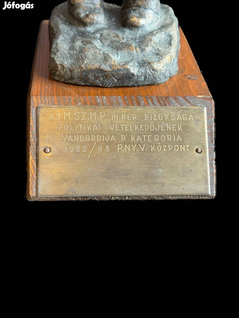 bronz, fatalpazat, 1983, hibátlan, 30 cm magas talpazattal, jelzett hátul réz plecsnin: Farkas Aladár Agitátor, elől díjazási szöveg