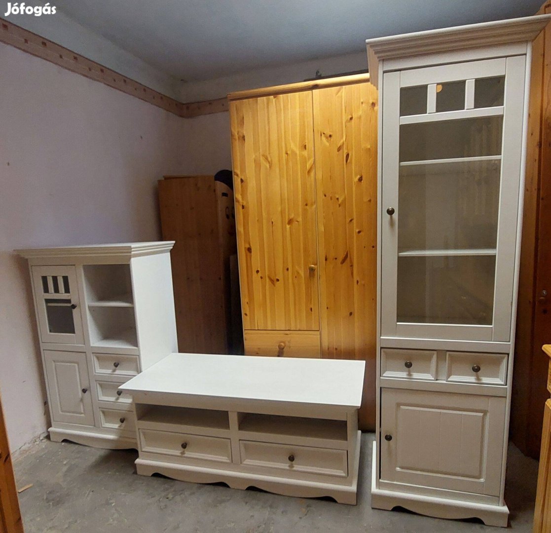 Eladó a képen látható minőségi, szép állapotban lévő fehér fenyő nappali bútor, töredék áron.
