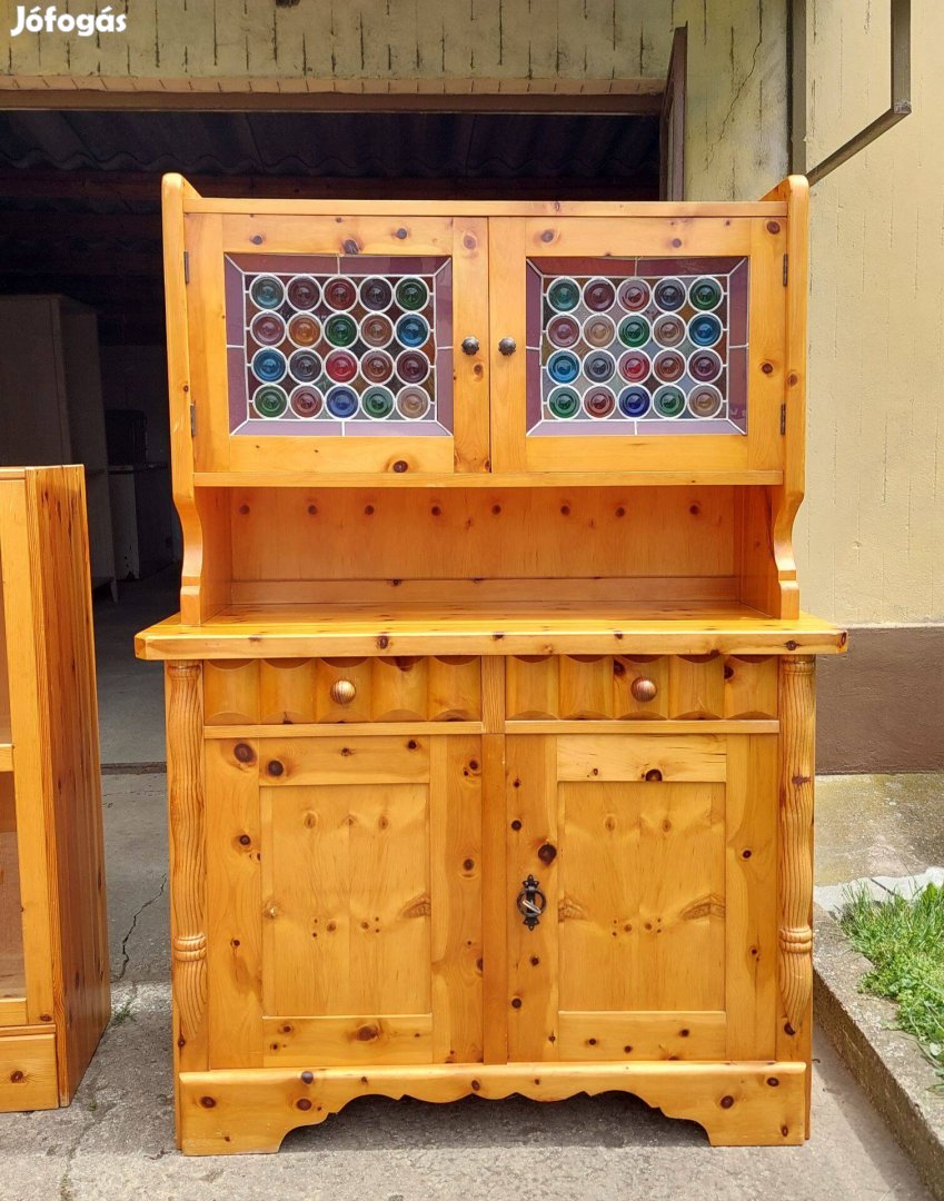 Eladó a képen látható jó állapotban lévő fenyőből készült, masszív, vastag, minőségi tálalószekrény. Az üvege könnyen cserélhető.
