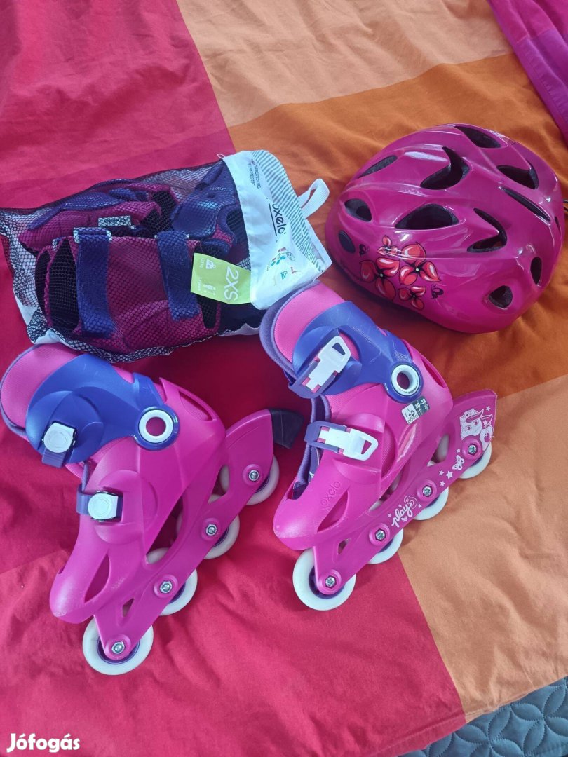 Teljes kezdő lány görkorcsolya szett eladó! Jó állapotban van! Csukló, térd és könyökvédő, bukósisak! Állítható méret!