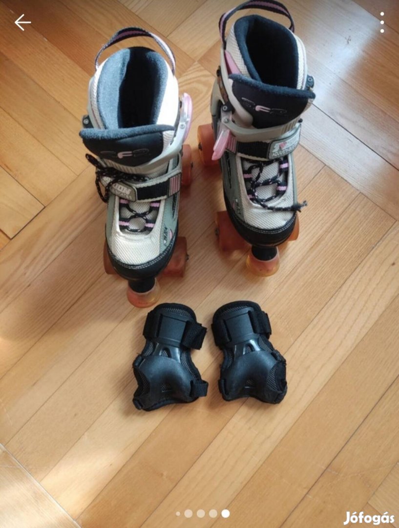 Thyphoon kétsoros görkorcsolya, állítható, 30,5- 34-ig, hibáit fotóztam, a boka csatrészt én nem tudom rákapcsolni, ez sz.e. cserélhető