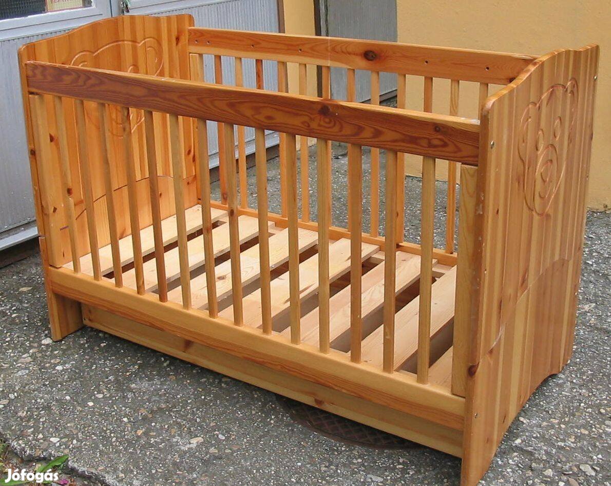 Eladó Egerben újszerű állapotú, Kikol gyártmányú, tömör fenyőből készült, rácsos, lakkozott kivitelű gyermek kiságy, ágyneműtartóval, az ágyvégeken macis motívumokkal.