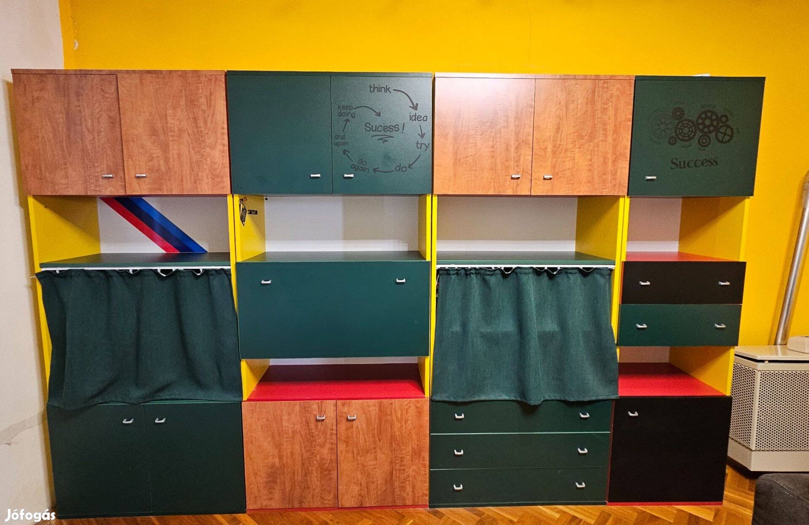 Eladó egy megkímélt, hibátlan állapotú ifjúsági szekrénysor. A függönyök utólag lettek feltéve, ezek levehetők. A bútor alapszínei sárga, piros, zöld. A fekete és barna ajtókon öntapadó matrica van. Az ajtók alatta, hibátlan állapotúak, ezek is levehetőek.