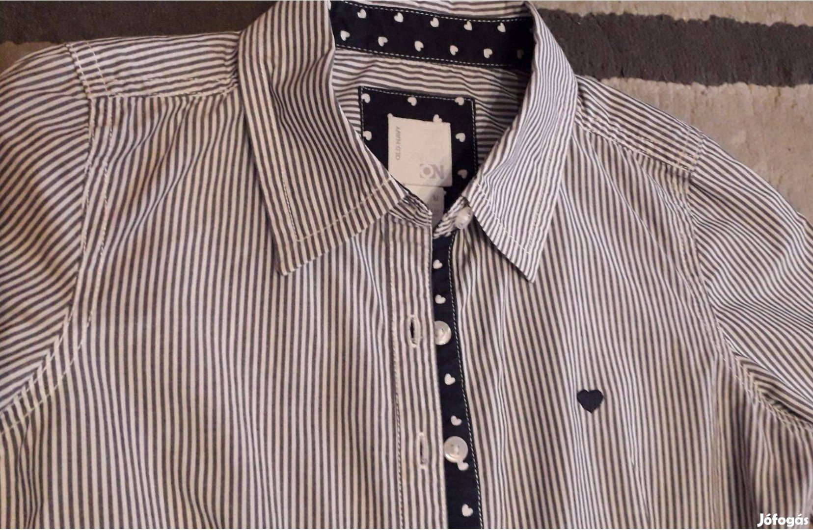 Kislány blúz 6-7 év, sötétkék-fehér újszerű csíkos szívecskés, hossz: 50 cm 1000 Ft