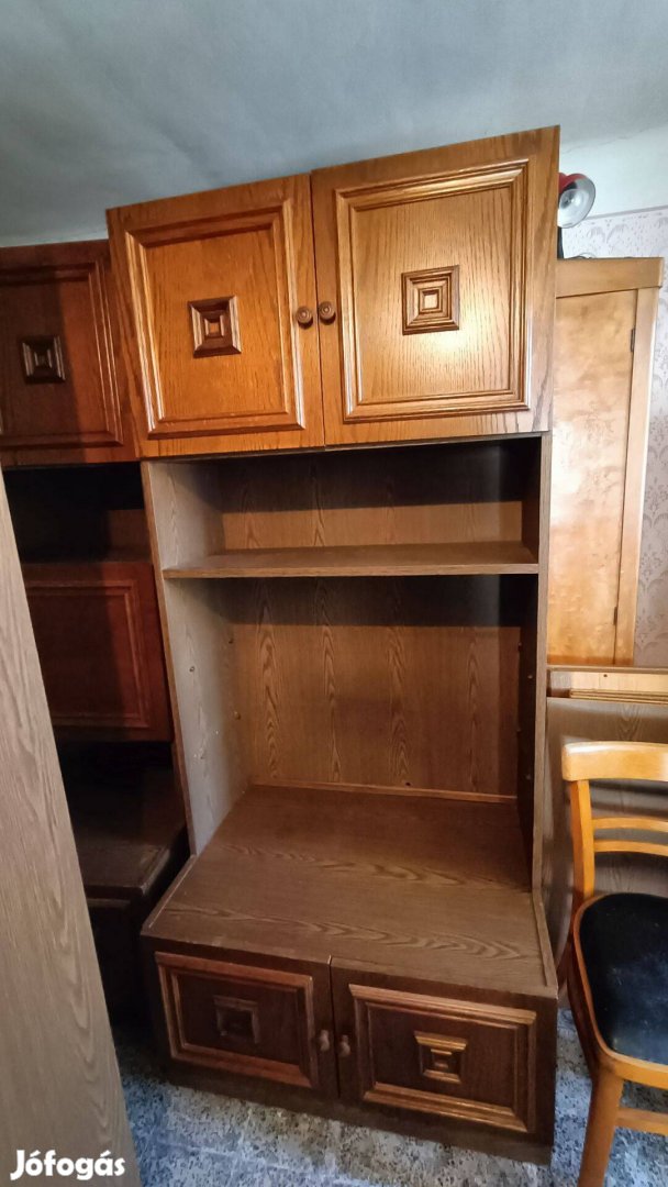 Eladó egy megkímélt állapotú, masszív, valódi fa hatású koloniál stílusú nappali bútor garnitúra, mely a 8090-es évek minőségi bútorgyártását idézi. A szett tartalmaz egy nagyméretű szekrénysort 4 fő taggal, több zárható és üveges elemmel, polcokkal és fiókokkal, valamint egy asztalt. A bútorok tömörfa hatású, aranytölgy színű felületkezelést kaptak, díszített frontokkal és réz színű fogantyúkkal. Az üvegajtók zöld, mintás betétei különleges, vintage hangulatot kölcsönöznek a helyiségnek.