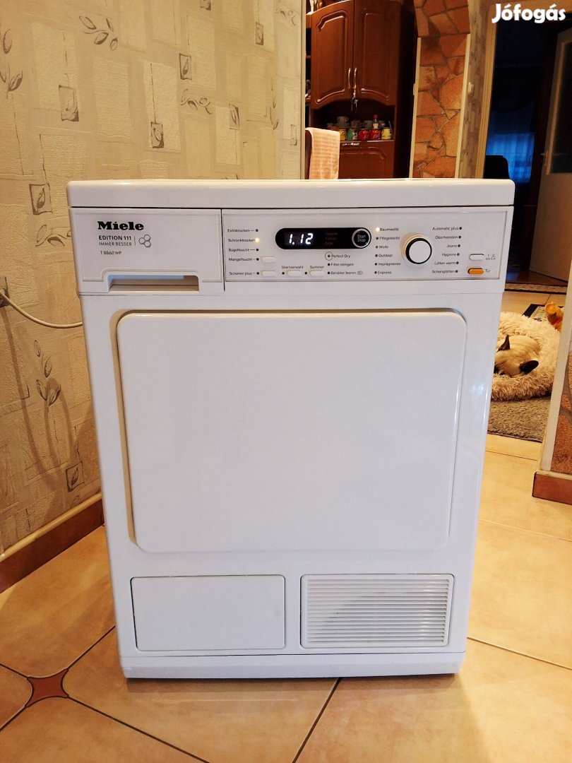 Miele T 8860 Edition 111 Immerbesser Mehsejtdobos Hőszivattyús A +++ Energiaosztalyos ! Szarítógep! 8 kilós. Ara: 199.990 ft.Tel: ! Gyönyörű szep teljesen makulátlan allapotban van. Hajszalkarc, nyomas, serüles abszolút nincs rajta. Patyolat tiszta kívül belül , frissen atvan tisztítva.Ennek köszönhetően kifogástalanul működik minden programon. Rengeteg programvalasztasi lehetőség van benne. Gyűrődesmentesen szarítsa meg a ruhakat szekrenyszárazra. Ritkan volt hasznalva.Barhol elhelyezhető a lakásban, szabadonalló. Sajat víztartalya van, ahova begyüjti a ruhakból kinyert vizet.Szallítasban tudok segíteni a nap bármely szakaszában, illetve hetvegen is((( szombat,.illetve vasárnap )))is az egesz ország területére. Akar 24 óran belül is. Köszönöm hogy elolvastad!