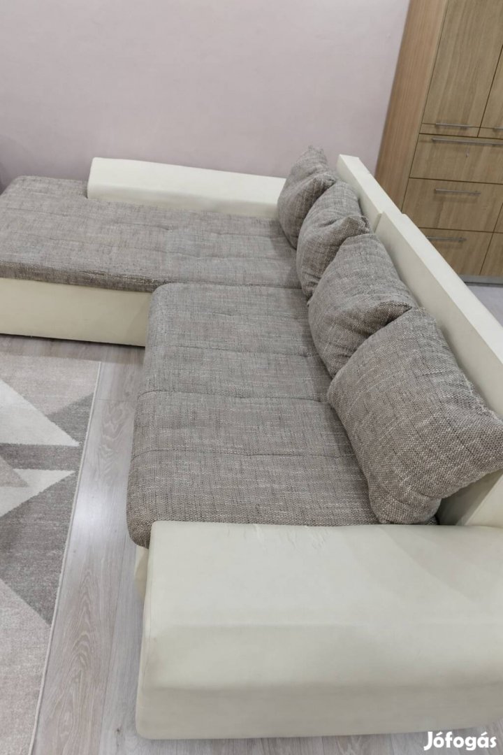 Eladó L alakú sarokülő balos 290x180 bézs barna színben zsákszövetes, ágynemű tartós.Két képen fotózva a sérülés de azt leszámítva jó állapotban van.