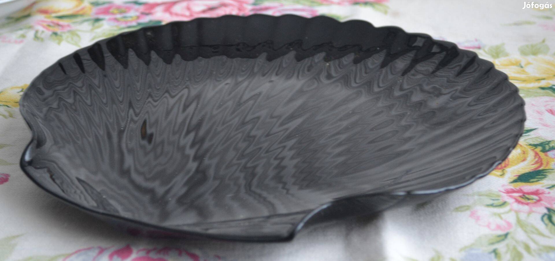 Letisztult, fényes fekete felületű, kagyló formájú nagyméretű tálaló. Szép ívű forma, elegáns megjelenés, erősebb, masszív darab. A fényes felületen a használatból adódó apró nyomok csak bizonyos fényben láthatók, összességében mutatós állapotú.