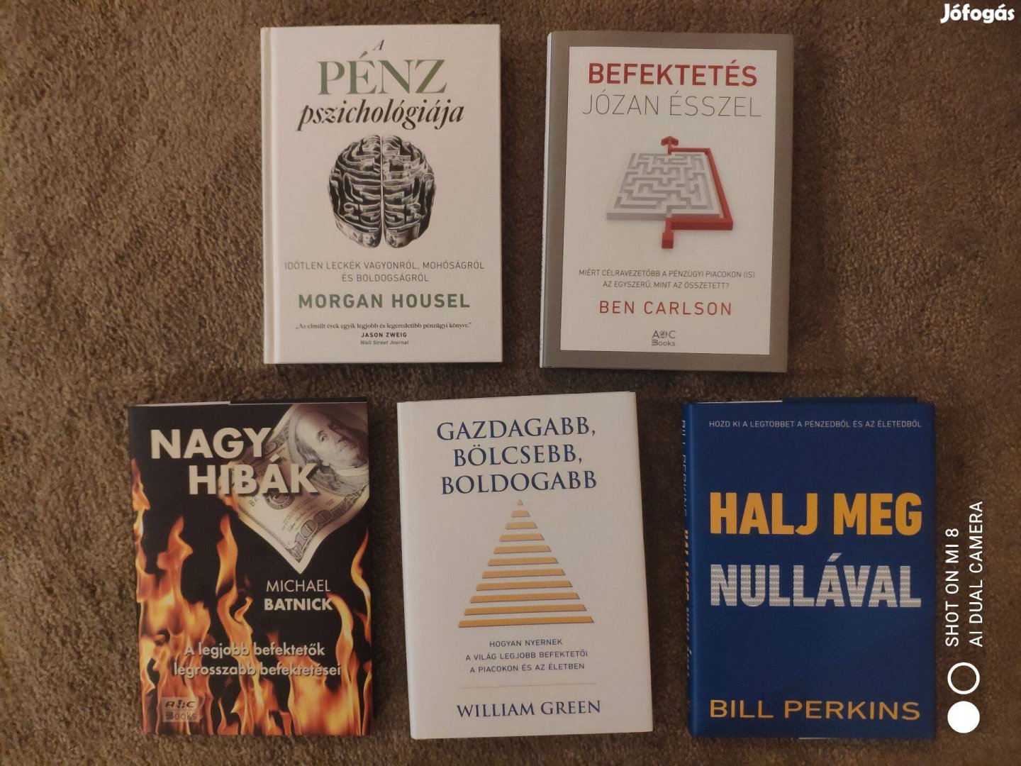 Eladó a képen látható 5 pénzügyi könyv. Tökéletes állapotban, egyszer olvastam őket. A Pénz pszichológiájáról hiányzik a plusz fedőlap, egyéként ökéletes állapotban van mind,