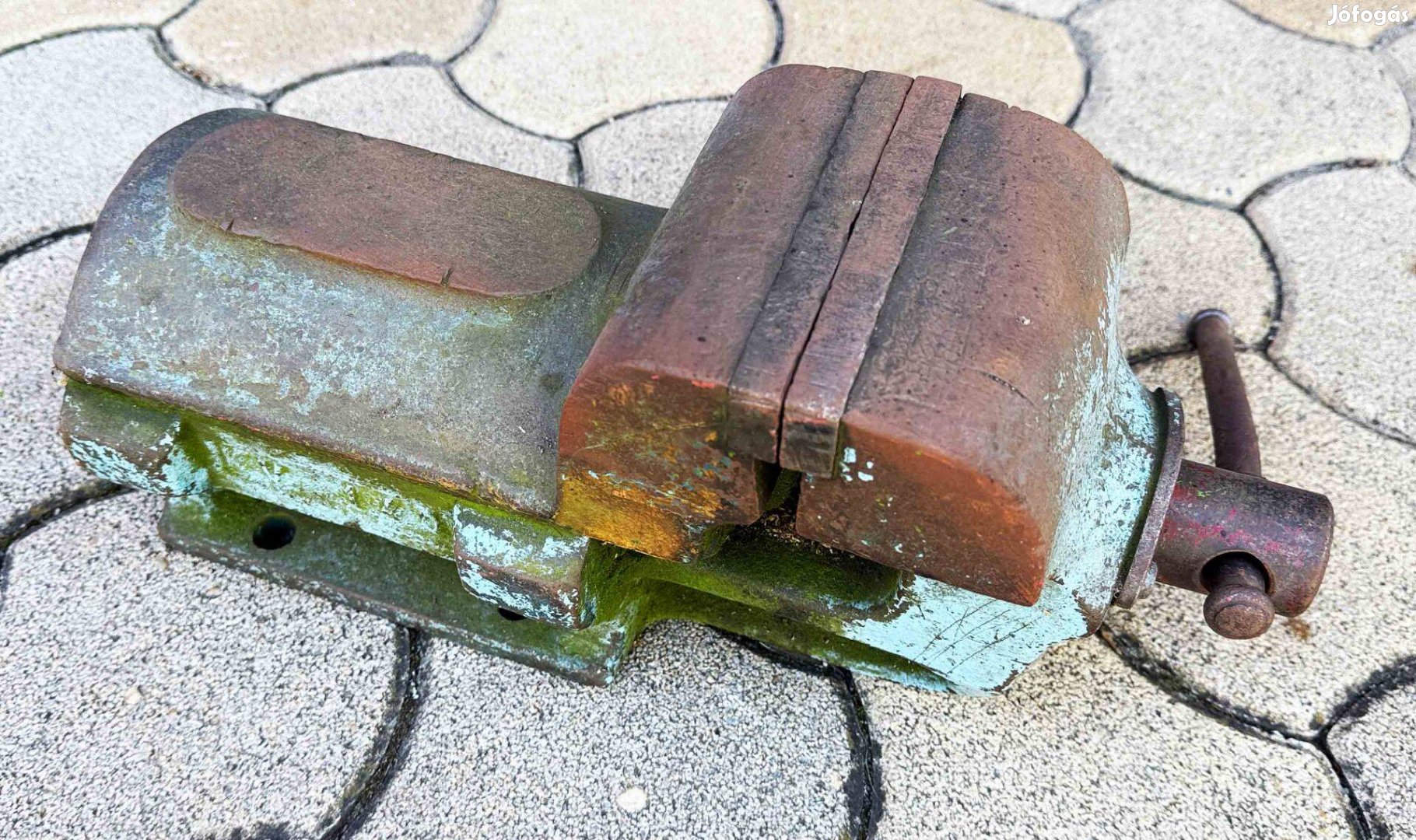 Robusztus méretű, megerősített pofával rendelkező ipari satu.