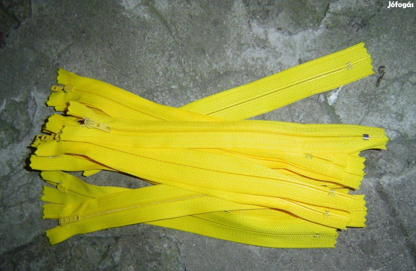 Eladó 35 db, a képen látható, 22 cm hosszú, 2.5 cm széles, műanyag fogazású, teljesen új zipzárok, citromsárga színben. Ára: 90 ft/db.