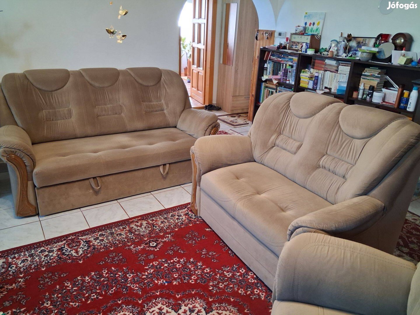 A képen látható 3 részes ágyazható nappali ülőgarnitúra eladó újszerű állapotban, világosbarna színben. Egyben a három rész
