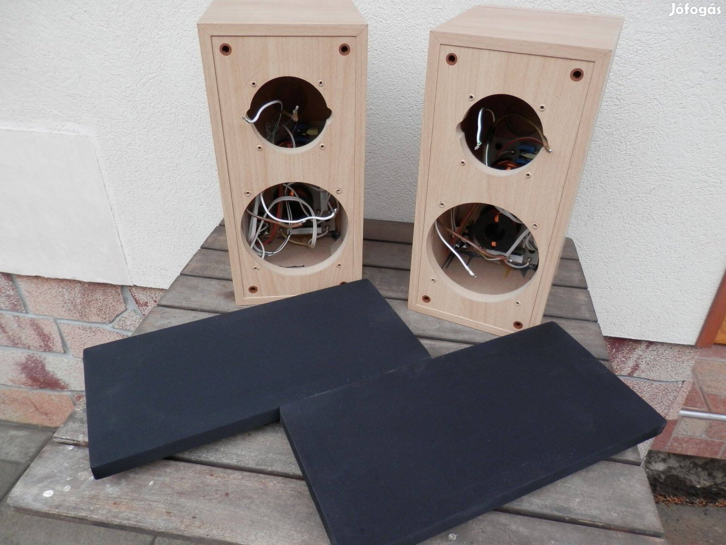 Eladó a fotókon szereplő dobozpáros , hangszórók nélkül . Az előlapok és a dobozok szép állapotúak , valamint a hangváltók , vezetékek és csatlakozóaljzatok is újszerűek . Méretei : 33 cm x 16 cm X 18 cm ( magasság x szélesség x mélység ) hangszóró kivágások : 12,5 cm és 8 cm . Küldés lehetséges .