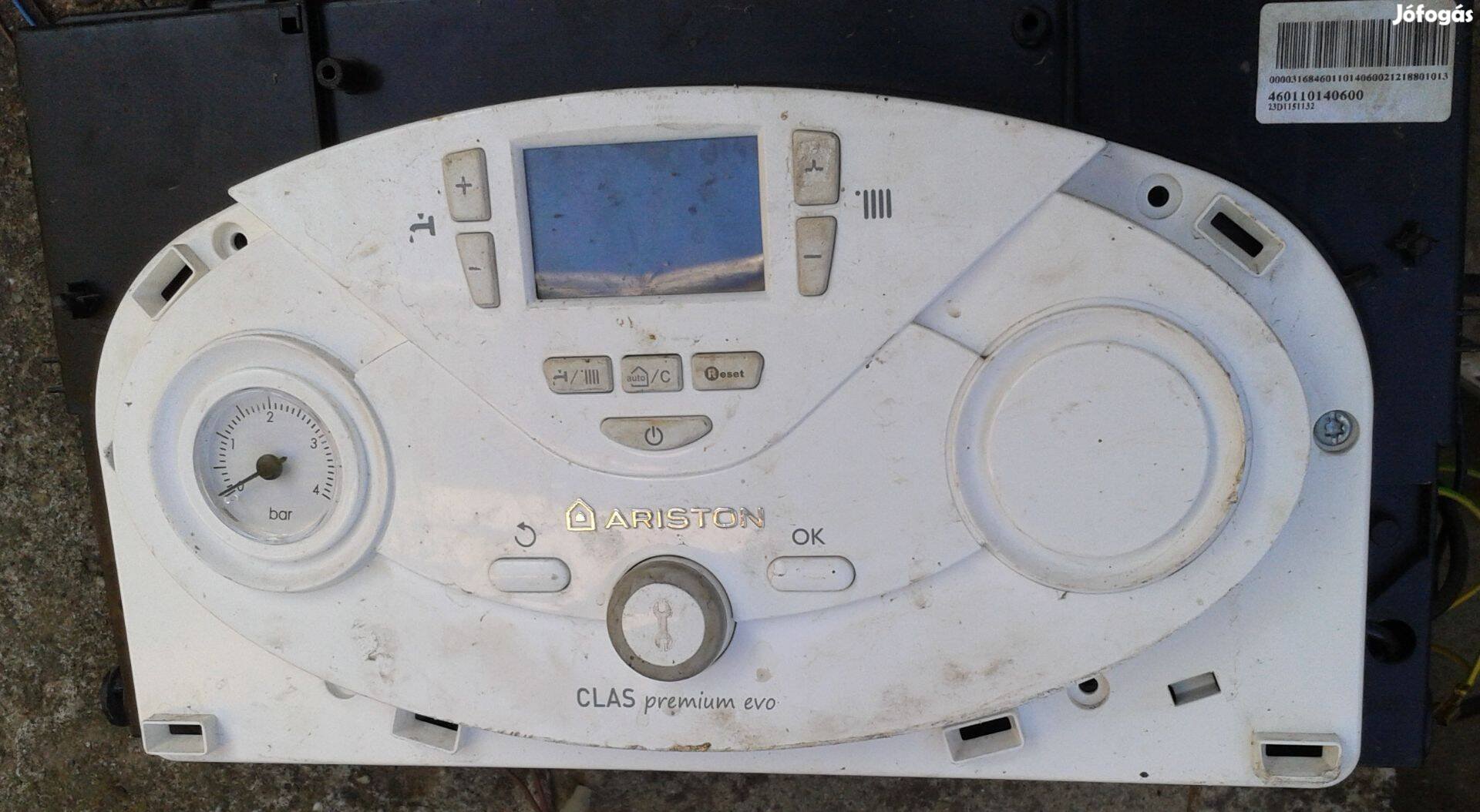Eladó előlapi vezérlő panel (fehér műanyag) a nyomógombokkal + vezérlő áramkör + kijelző áramkör + tekerő gomb Ariston Clas kondenzációs kazánhoz.