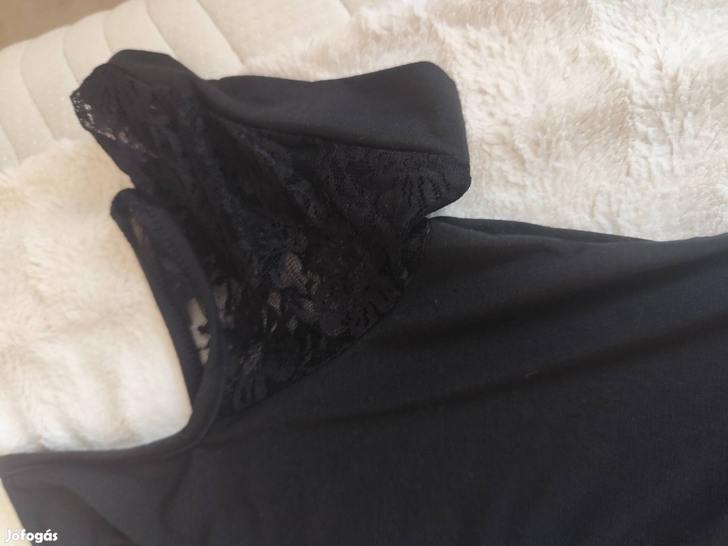 Fekete színű váll kidobós pólóblúz három gomb díszítéssel az újján csipke betét rugalmas anyagból készült kényelmes viselet méretei váll szélesség 46cm hossza 72cm anyaga poliészter