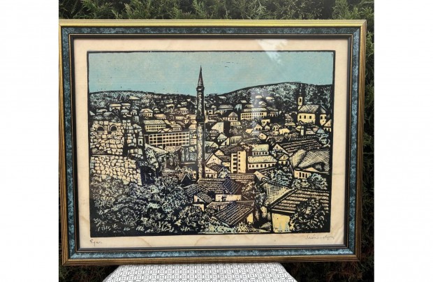 Mészáros Lajos: Eger, színezett linómetszet keretben