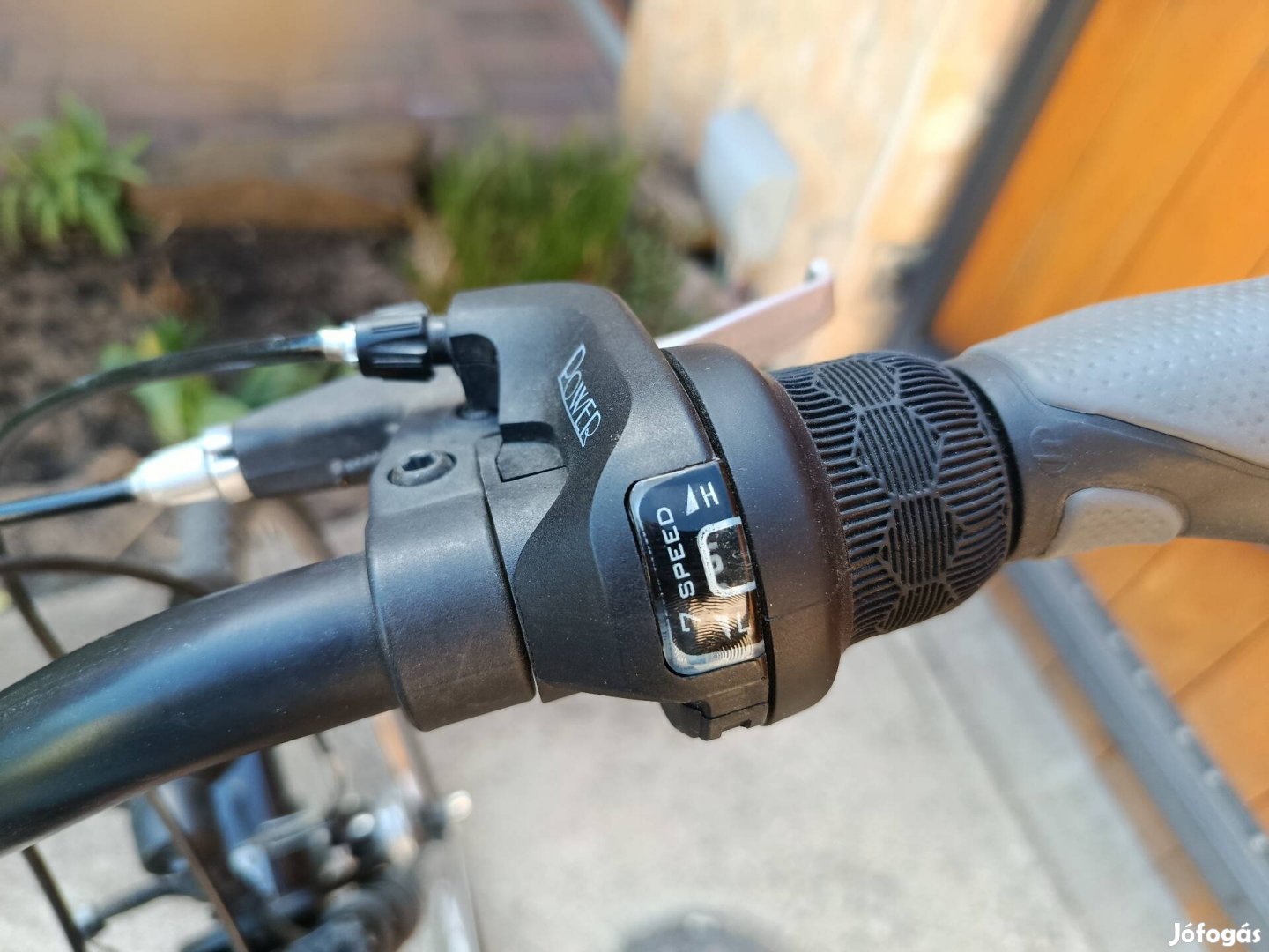 Jó állapotú 28-as alumínium vázas, német, 21sebességes kerékpár Shimano váltóval, agydinamóval.