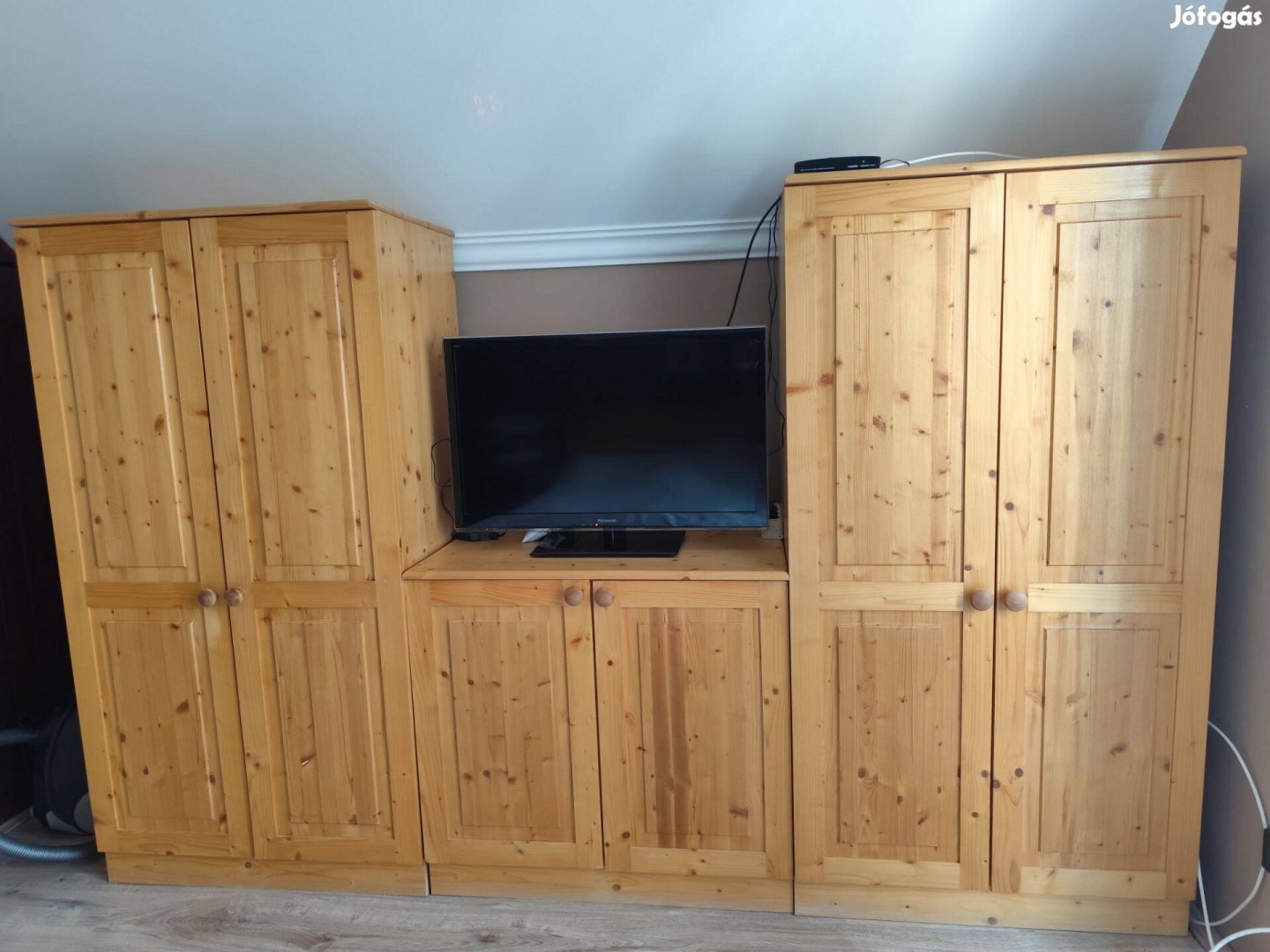 3 elemes lakkozott fenyő szekrénysor eladó. A szekrények mérete a fényképen jelölve. 2 db akasztós szekrény és 1 db tévé tartónak is használható polcos szekrény.