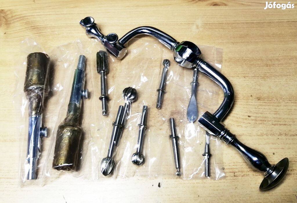 Antik rozsdamentes orvosi eszköz, sebészeti kézifúró, tartozékokkal