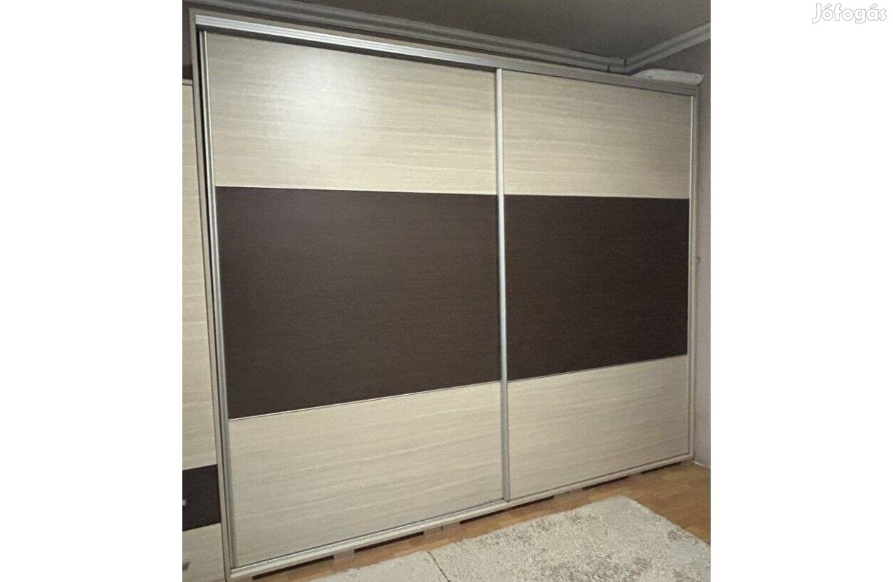 Alig használt, nagyon jó állapotú bézs/barna színű tolóajtós gardrób szekrény költözés miatt eladó. A szekrény belülről három függőleges részre van osztva (100 + 79 + 100 cm), a két szélső részen felül ruhalift (az akasztó mechanikailag mozgatható egy kar segítségével), középen 2 fiók és alul 2 polc található. A szekrény középső függőleges részén pedig polcok találhatóak.