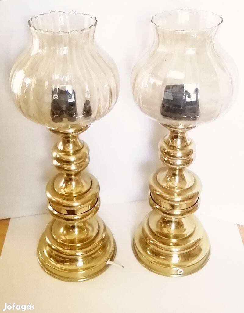 Bronz bordázott oszlopos asztali lámpa pár, különleges burával