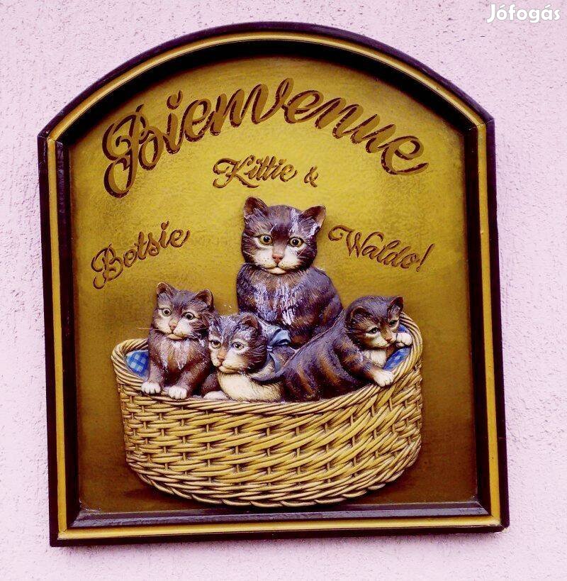 Domborműves üdvözlő reklámtábla cicákkal, keretezve