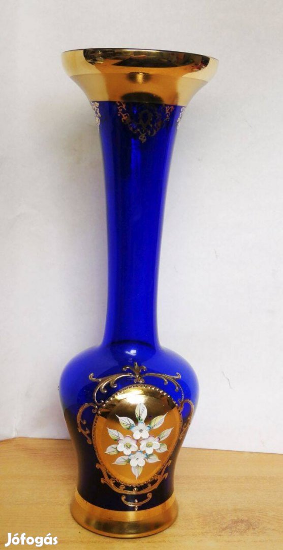 Egyedi szépségű kék aranyozott Bohemia váza dús eklektikus zománc fest