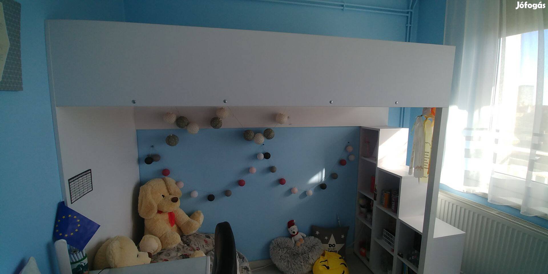 Eladó a képen látható galériás ágy 90*200 fekvőfelületű, "polclépcsővel" - matrac és ágyrács nélkül. Kiváló, erős, masszív anyag és kivitelezés, egyedi készítés. Csak személyes fizetés és átvétel.