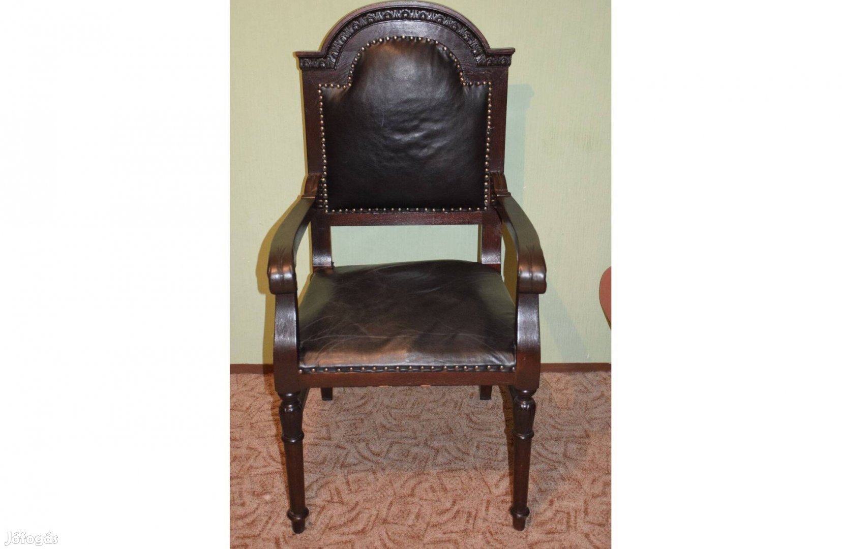 Masszív, sötét fa vázzal készült, valódi bőr kárpitozással, díszszegecsekkel. Kényelmes ülés, stabil szerkezet ideális dolgozószobába, nappaliba vagy akár dekorációs célra is.