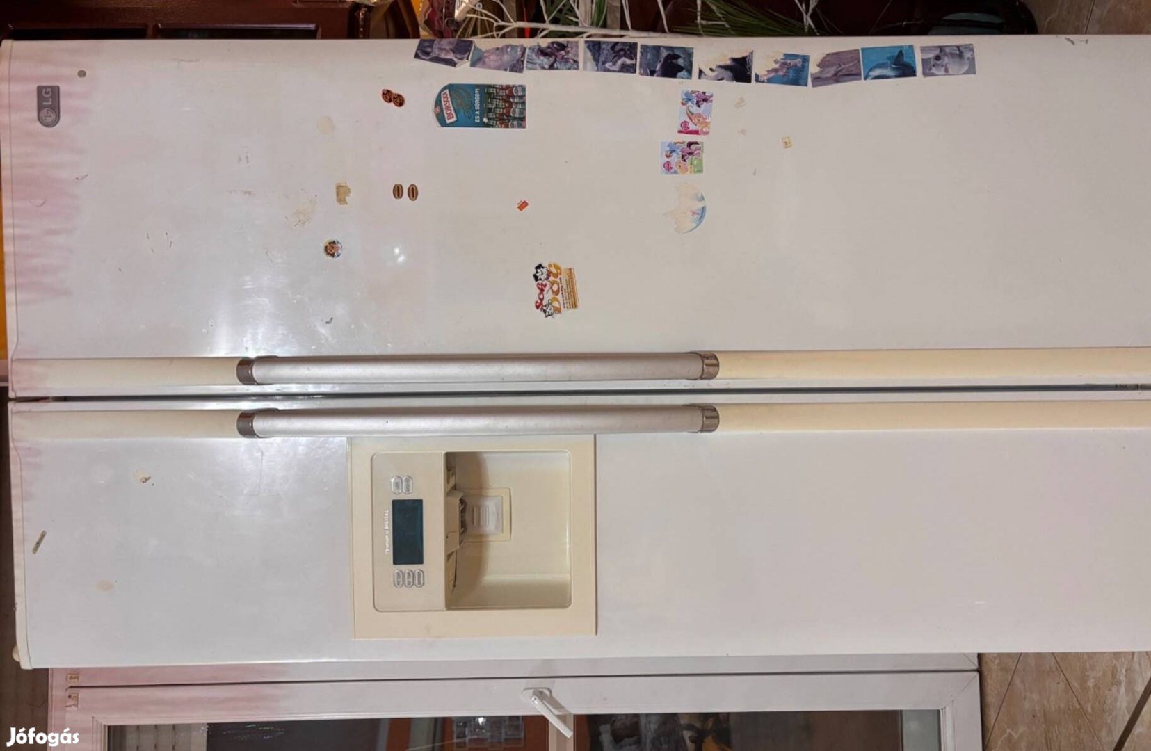 Eladó a képen látható hűtő, fagyasztó. A hűtő működik, csak a víz/jég adagoló nem működik.
