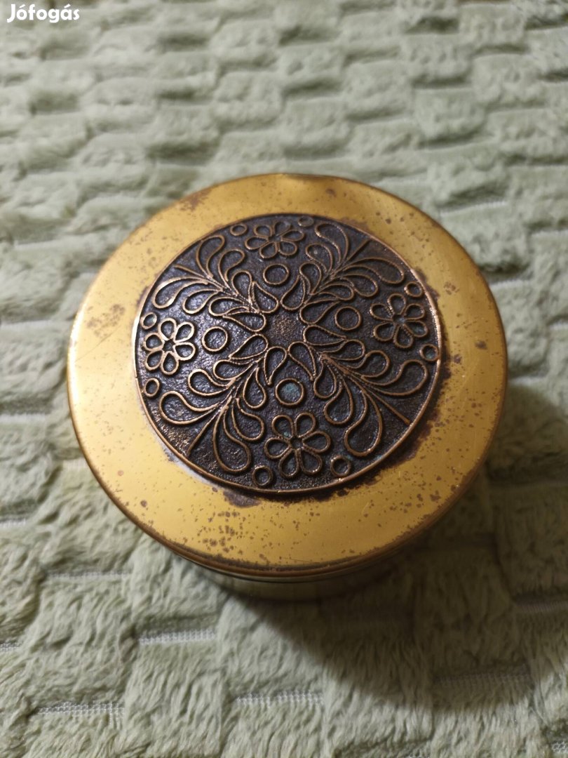 Fedeles sárgaréz antik doboz, gyűrűtartó. Fedele mandala dombornyomott. Belseje filc. Nincs tisztítva. 8,5cm széles, 4,5cm magas.