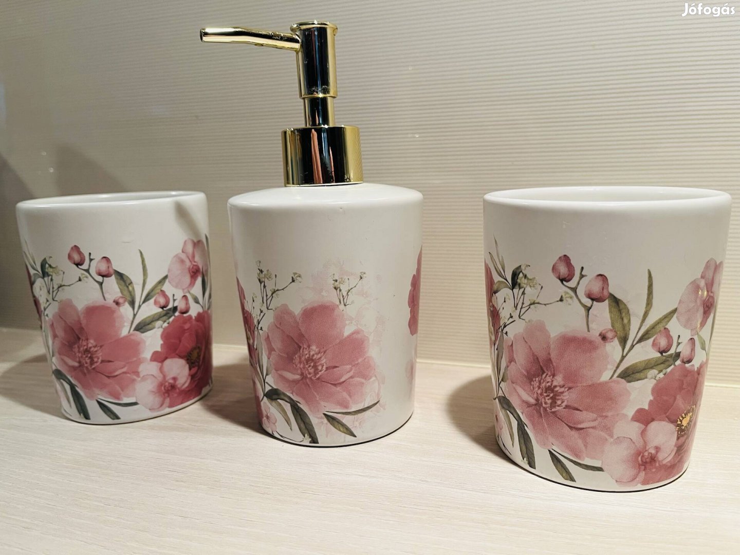 Eladó a képeken látható alig használt , törékeny , modern , virágmintás Folyékony Szappanadagoló és 2 db Fogkefetartó Pohár Fürdőszobai Kiegészítő.