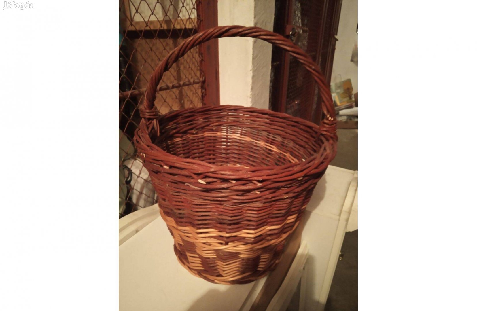 Vesszőből font kosár. Kaptuk, gyakorlatilag sosem volt használva. A felső átmérője 32 cm, az alsó átmérő 23 cm és 24 cm magas + a fül.