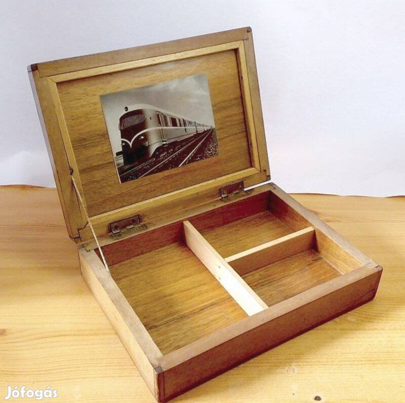 Furnérozott diófa ládika, mozdonyos fotóval, ékszeres, gyöngyöző