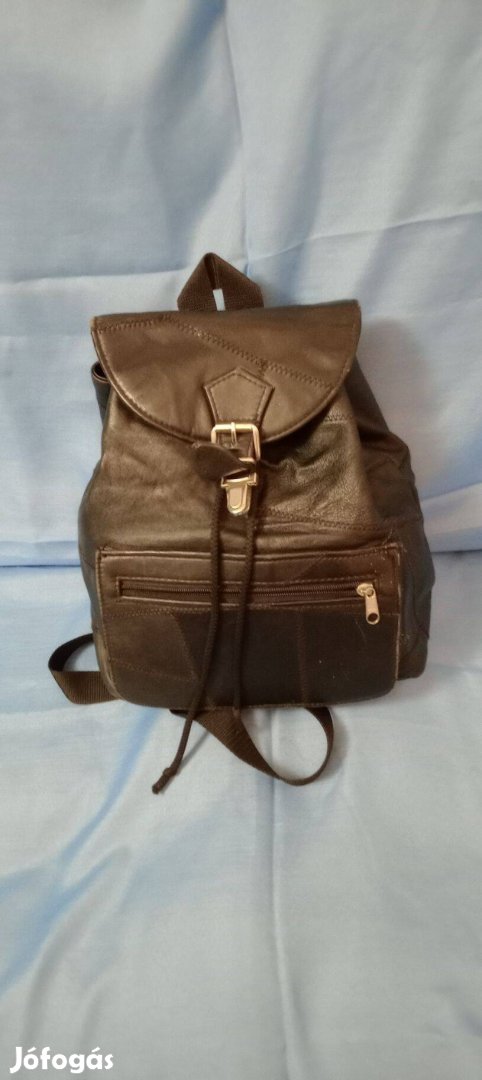 Fekete bőr darabokból készült hátizsák eladó. Magassága: 30 cm. Szélessége: 32 cm. Mélysége: 16 cm. Nem mai darab, de a használat nyomai alig látszanak.