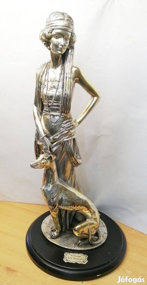 Hölgy kutyával, szecessziós stílusú ezüsttel bevont szobor Auro Belcar