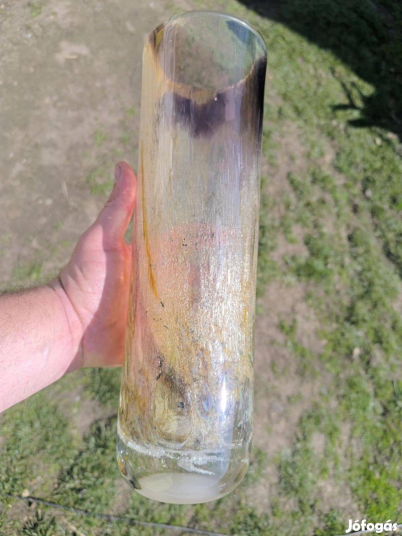 Technika: A felületén látható irizáló (szivárványos) csillogás, a beleolvasztott fémoxidok vagy a "húzott" mintázat arra utal, hogy ez egy kézzel formázott tárgy. Ez a stílus jellemző volt a szecessziós üvegekre (pl. Loetz vagy Tiffany stílus), de a modern, 70-es évekbeli stúdióüvegekre is.