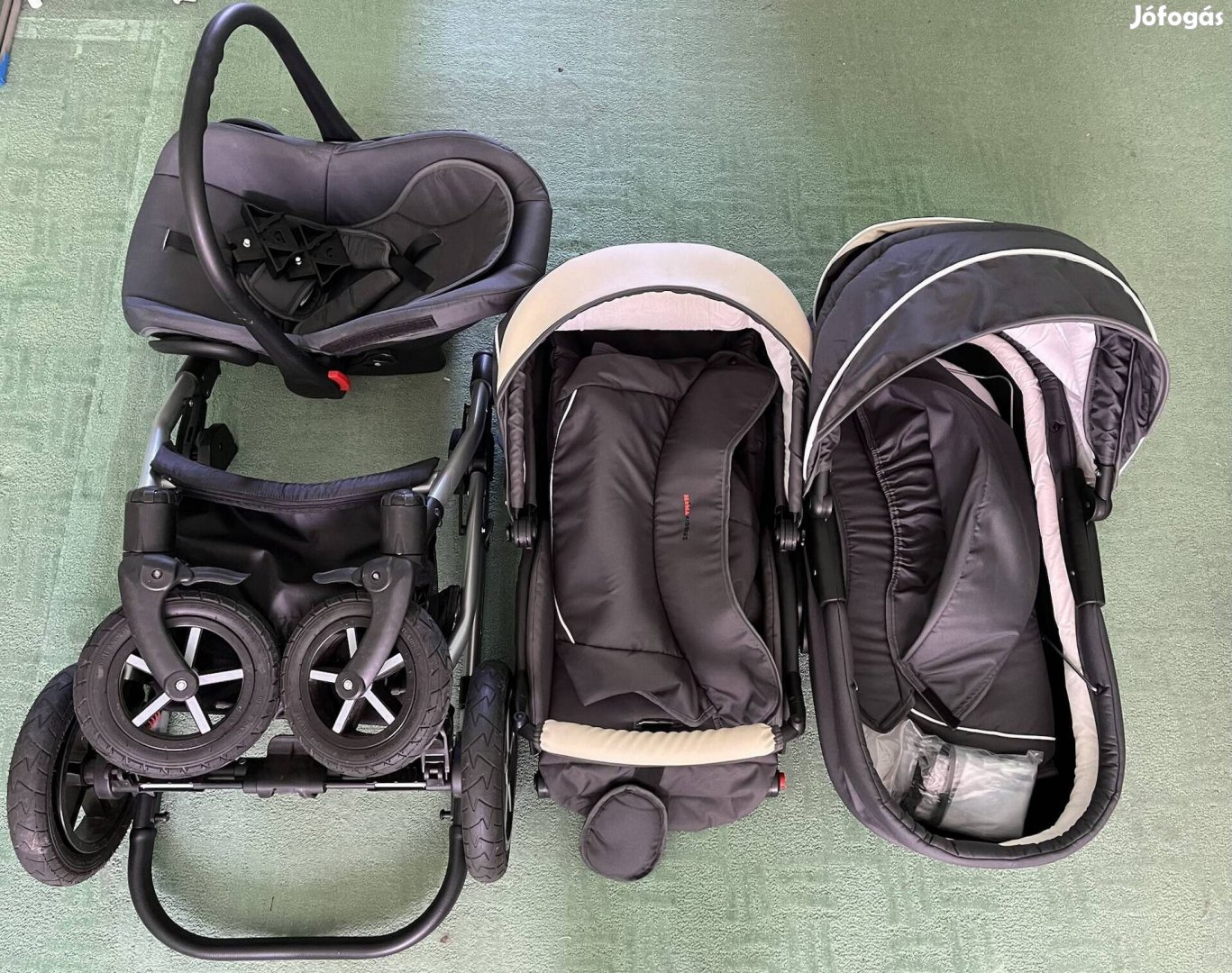 3 az 1-ben babakocsi eladó teljesen újszerű állapotban- kb.10 alkalommal volt használva, ahogyan az a kerekein is látható.