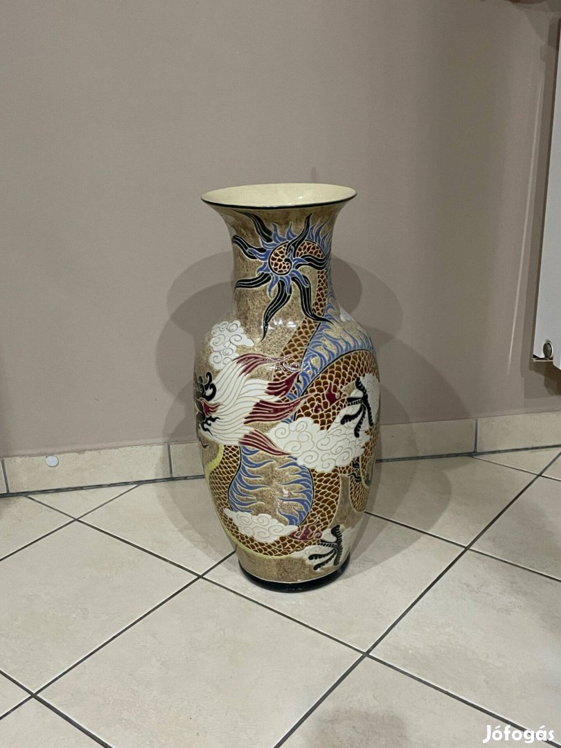 Nem kínai! Nagyméretű 58 cm padlóváza sárkány motívumokkal a 70 es évek végéről. Hibátlan állapot, karc és hajszál repedés mentes. Szolnokon megtekinthető, átvehető, szállítás megbeszélés alapján személyesen megoldható.